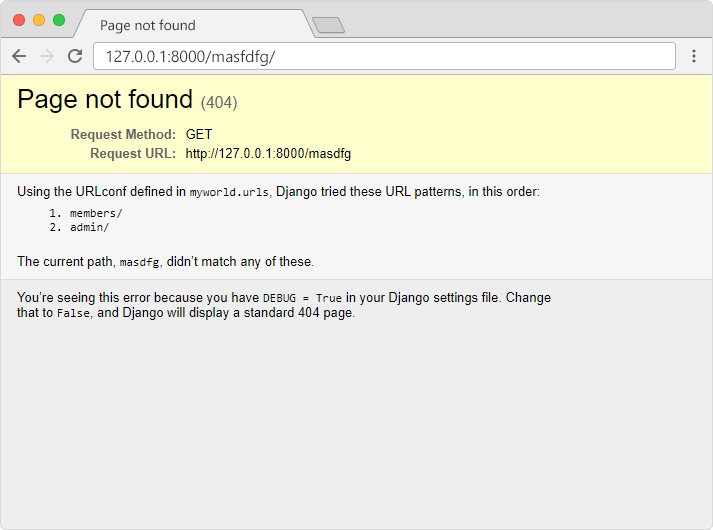 In the browser window, type 127.0.0.1:8000/masfdfg/ in the address bar.