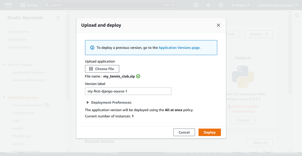Now you have a .zip file, containing the changes, and you can upload it to Elastic beanstalk: