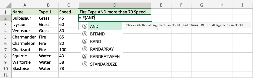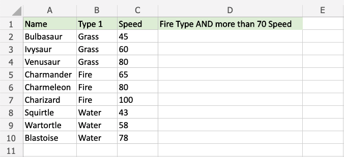 Now each row has a check for both being Fire type and Speed greater than 70: