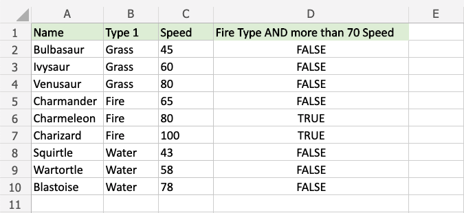 Now, each row has a check for Fire Type and Speed greater than 70:
