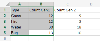The chart gives a visual overview for the "Grass", "Fire", "Water" and "Bug" type Pokemons in generation 1.