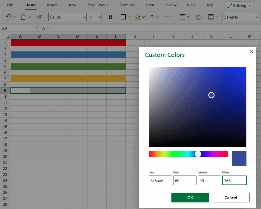 Excel has a set of themes and standard colors available for use. You select a color by clicking it: