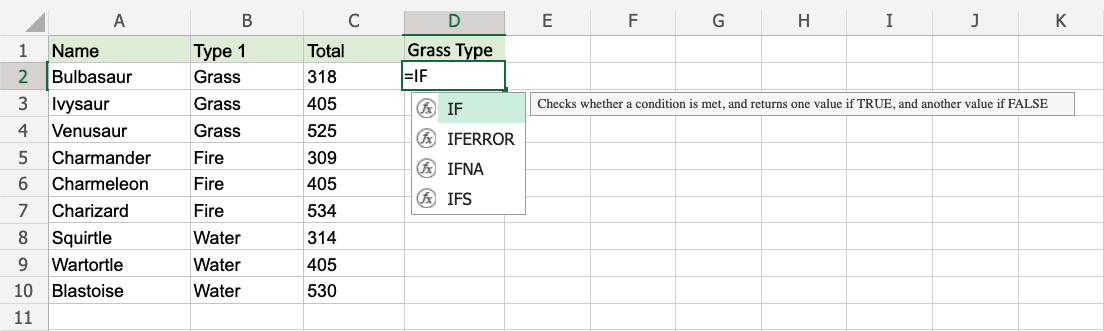The condition is if the "Type 1" value for the Pokemon is "Grass".