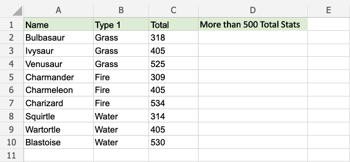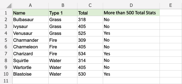 The function can be repeated with the filling function for each row to perform the same check for each Pokemon: