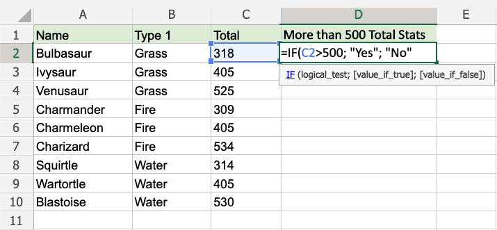The IF function is a premade function in Excel, which returns values based on a true or false condition.