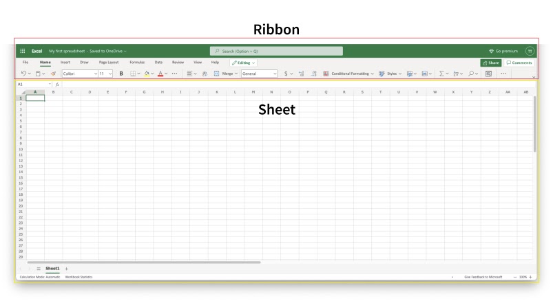 Have a look at the picture below. The Ribbon is marked with a red rectangle and the Sheet is marked with a yellow rectangle: