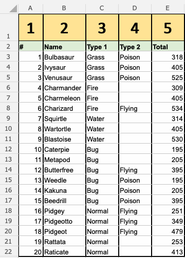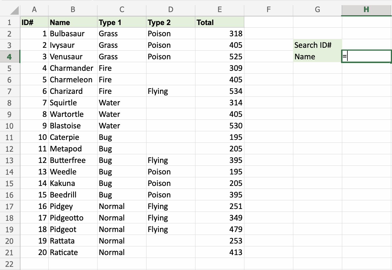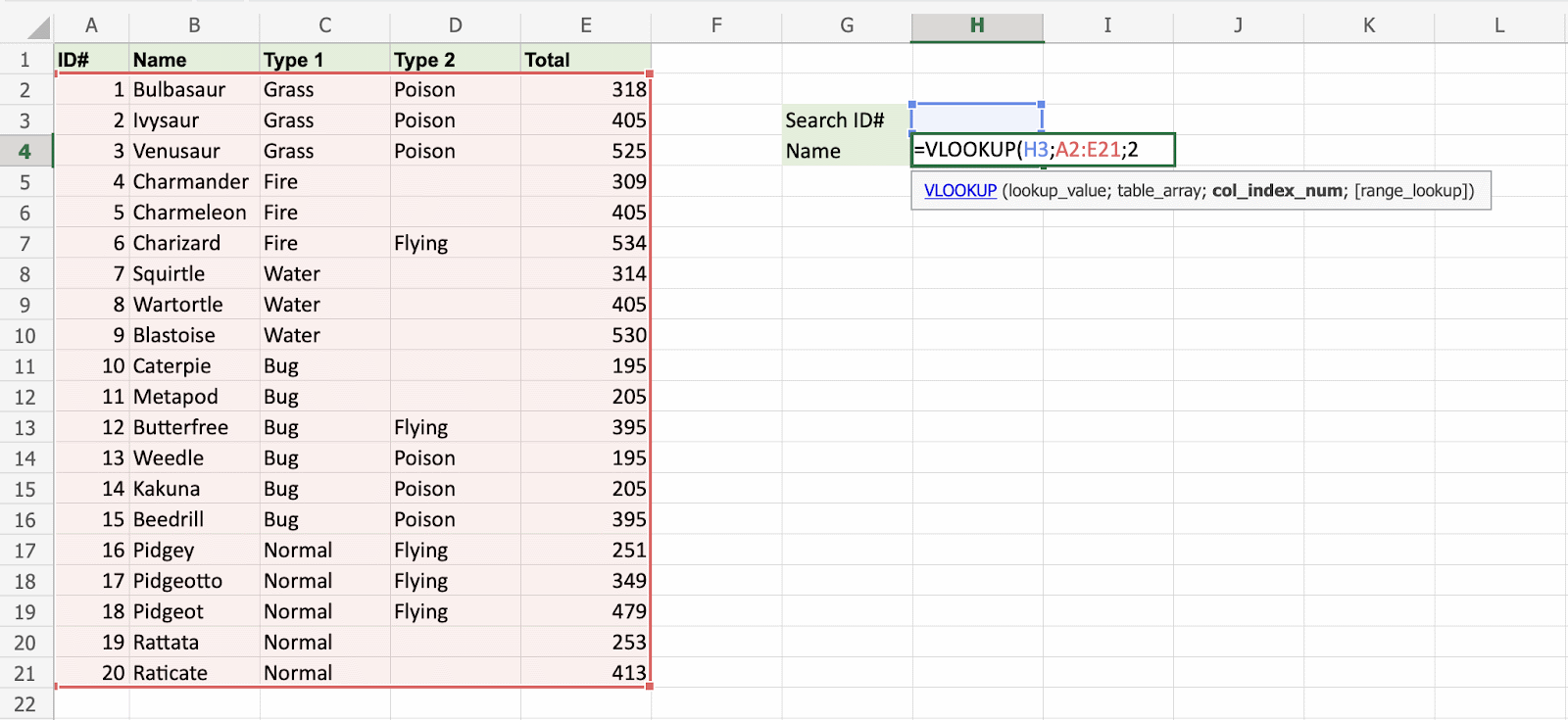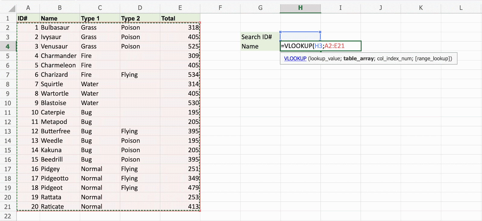Have a look at that! The VLOOKUP function has successfully found the Pokemon Squirtle which has the ID# 7.