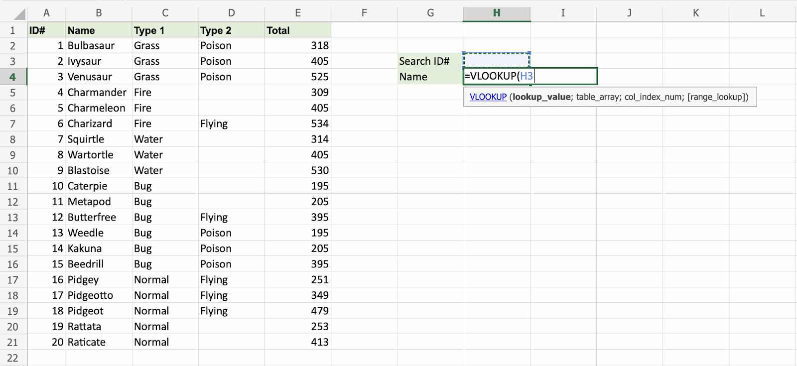 H3 selected as lookup_value. This is the cell where the search query is entered. In this case the Pokemons ID#.