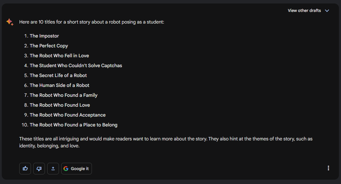 Suggest 10 titles for a short story about a robot posing as a student. It is written from a teenager's perspective, and the robot is almost a perfect copy of a human. They find friends and fall in love. But they still can't solve captchas when browsing the internet.