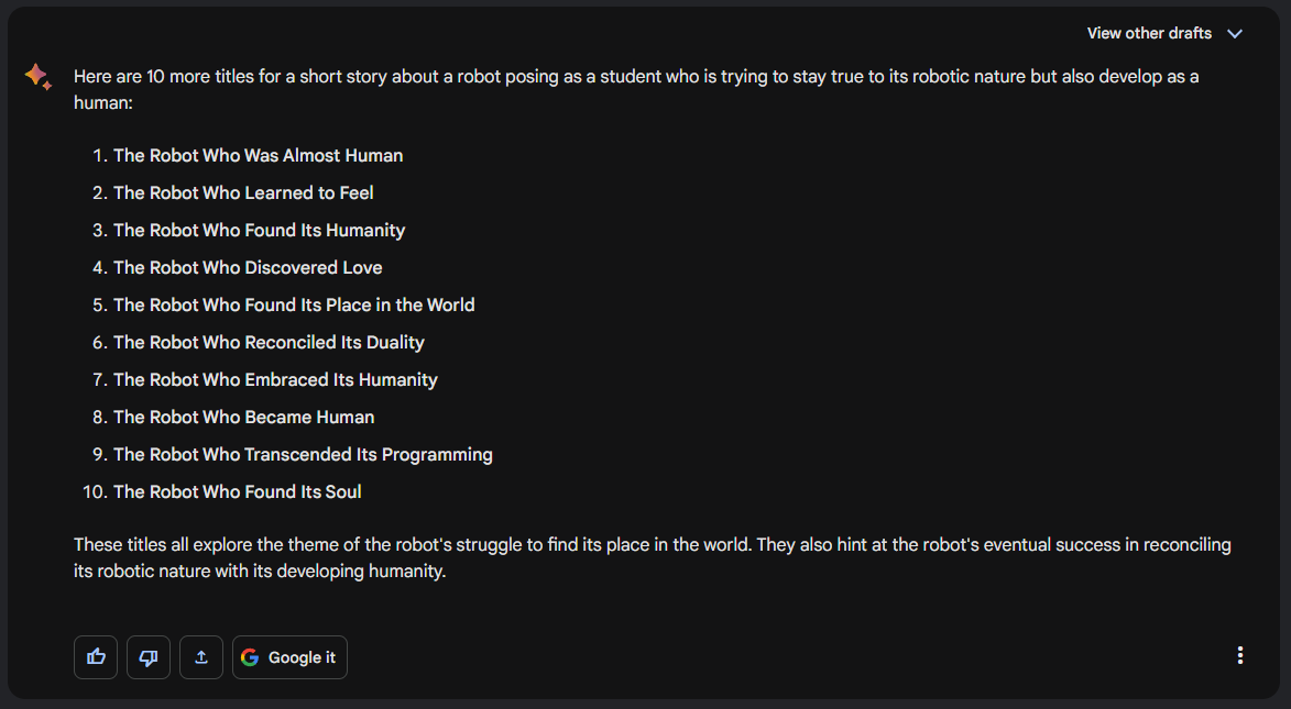 Number 2 suits the story well, as the story is mainly about the robot figuring out how to stay true to its robotic nature but at the same time develop as a human. Based on that, suggest 10 more titles.