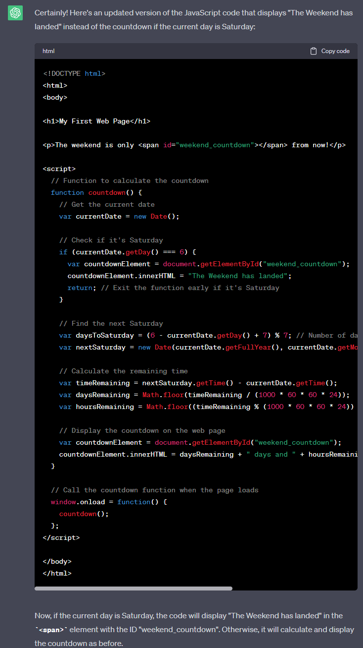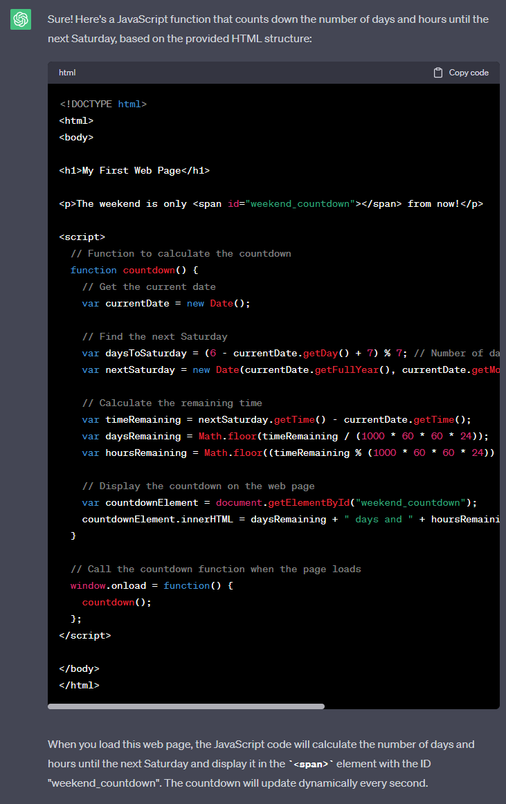 For example, write, "Create a function that counts down the number of days and hours until the next Saturday." instead of "Make code to find the closest Saturday"