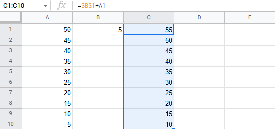 Great! You have successfully used absolute reference to add B1(5) with the range A1:A10.
