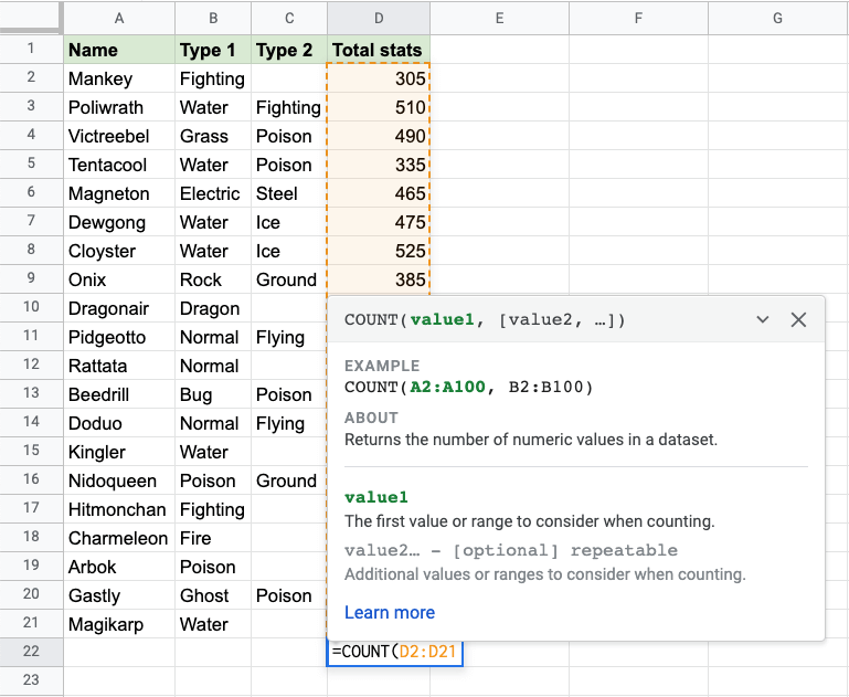 Apply the =COUNT function to range D2:D21. Counting the cells of Pokemon Total stats, which is numbers only: