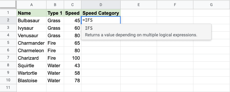 The IFS function is a premade function in Google Sheets, which returns values based on one or more true or false conditions.