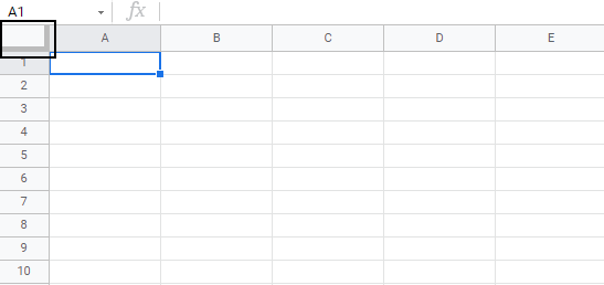 The entire spreadsheet can be selected by clicking on the rectangle in the top-left corner of the spreadsheet: