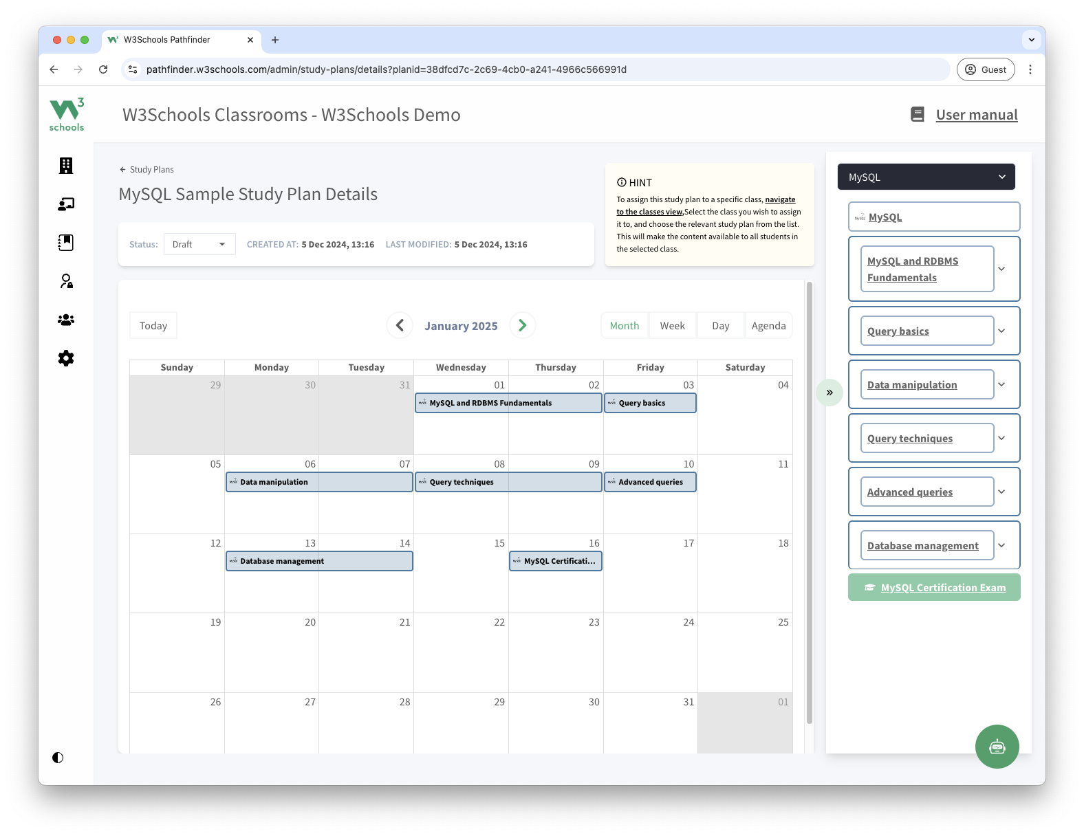 Save time with pre-built teacher materials and study plans. Easily organize your class with a timeline from the introduction of MySQL to the final exam.