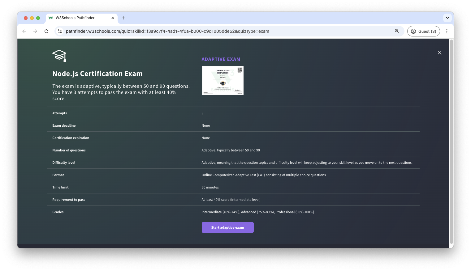The certification exam is adaptive and graded; students will get a grade from intermediate, advanced to professional.