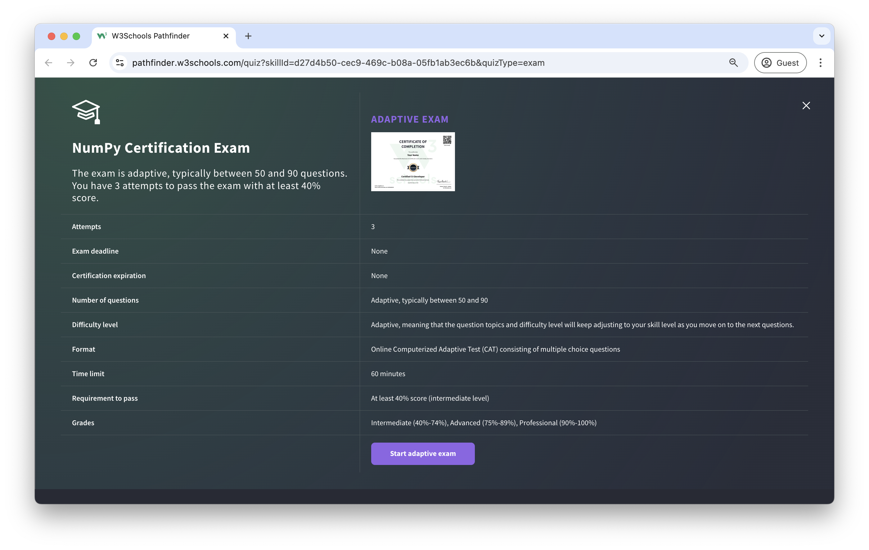 The adaptive certification is adaptive and graded; students will get a grade from intermediate, advanced to professional.