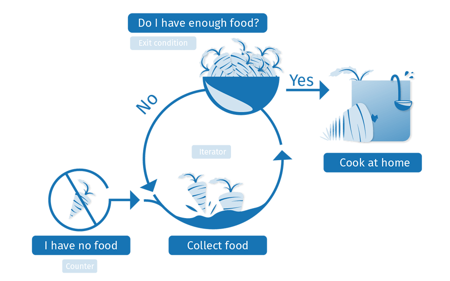 - Итератор постепенно увеличивает счётчик на некоторое значение на каждом шаге цикла, пока не достигнуто условия выхода. Мы явно не показали это в изображении, но если предположить что фермер собирает две порции еды в час, то после каждого часа, количество еды, которое у него имеется, увеличивается на две порции, и он проверяет достаточно ли у него еды сейчас. Если у него собралось 10 порций (условие выхода), он может остановить сбор и вернуться домой.