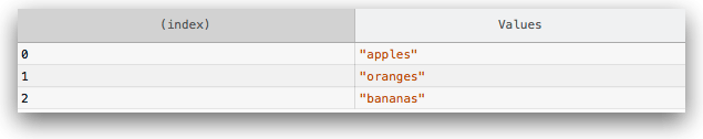 Первая колонка таблицы будет озаглавлена как (index). Если data представлена массивом, тогда значения первой колонки будут представлять индексы массива. Если data- объект, тогда значения первой колонки будут представлять свойства объекта.